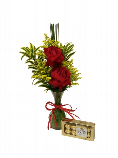 Surpreenda quem você ama com a beleza desse Arranjo com 02 Rosas Colombianas e o sabor irresistível do Ferrero Rocher.