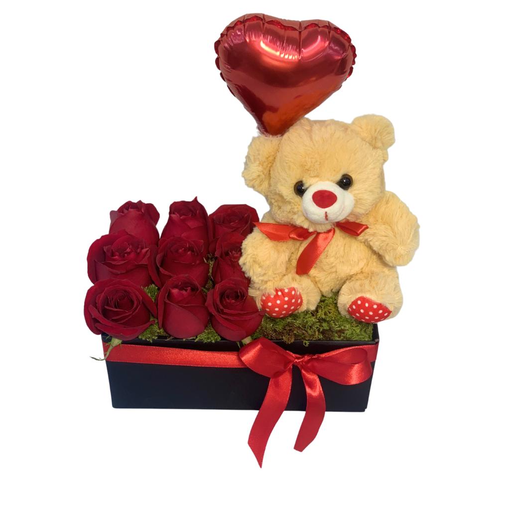 Surpreenda quem você ama com um lindo Arranjo de Rosas, um Urso de Pelúcia e Balão em forma de coração.
