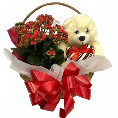 Cesta Buquê Kalanchoes e Urso de Pelúcia, tamanho (P).
