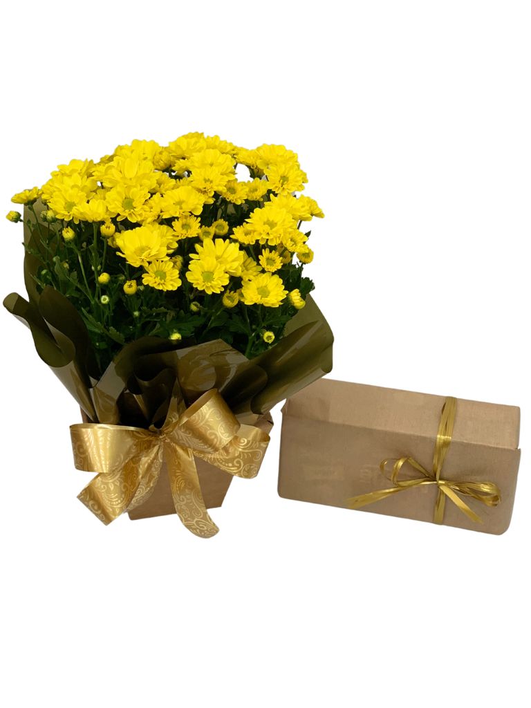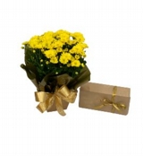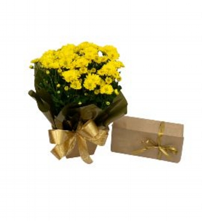 Vaso de Margaridas Amarelas e caixa de bombom de chocolates variado.